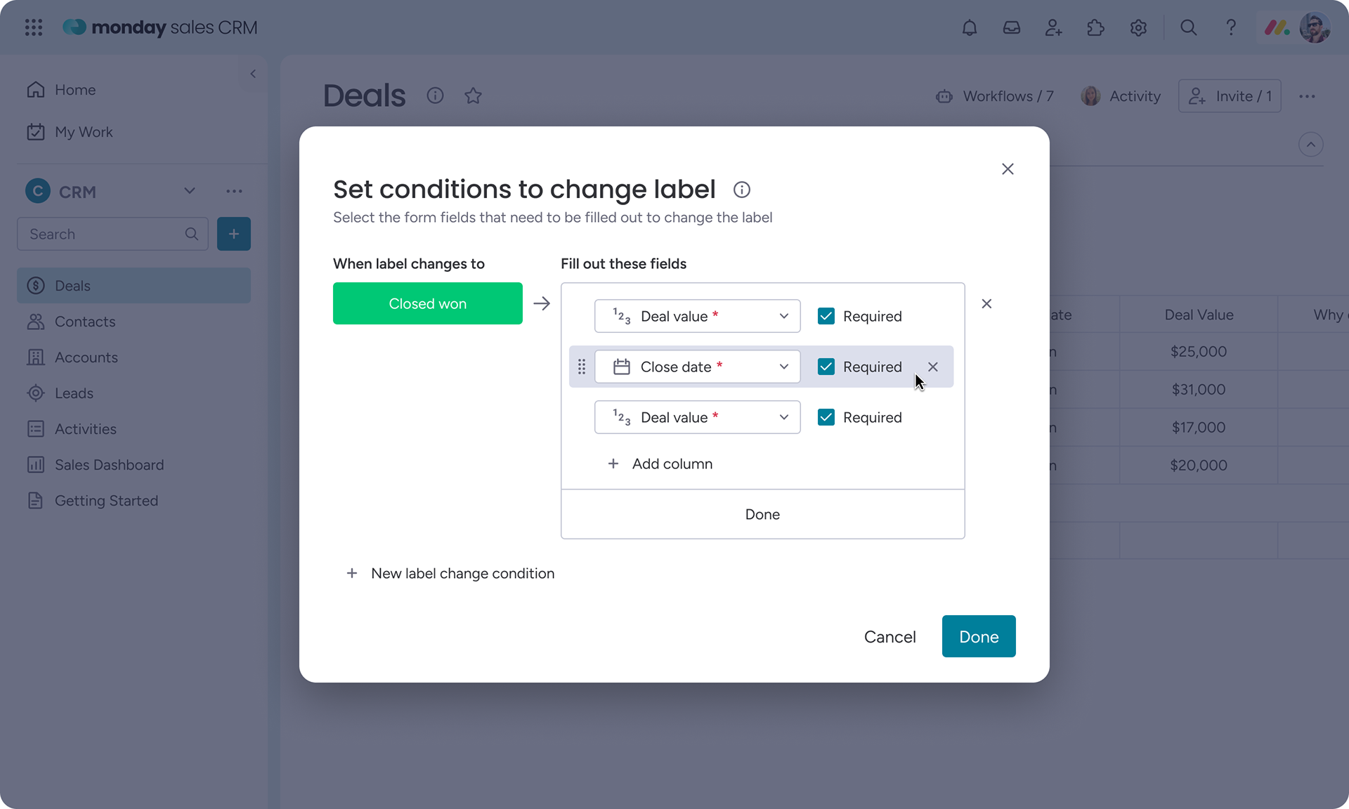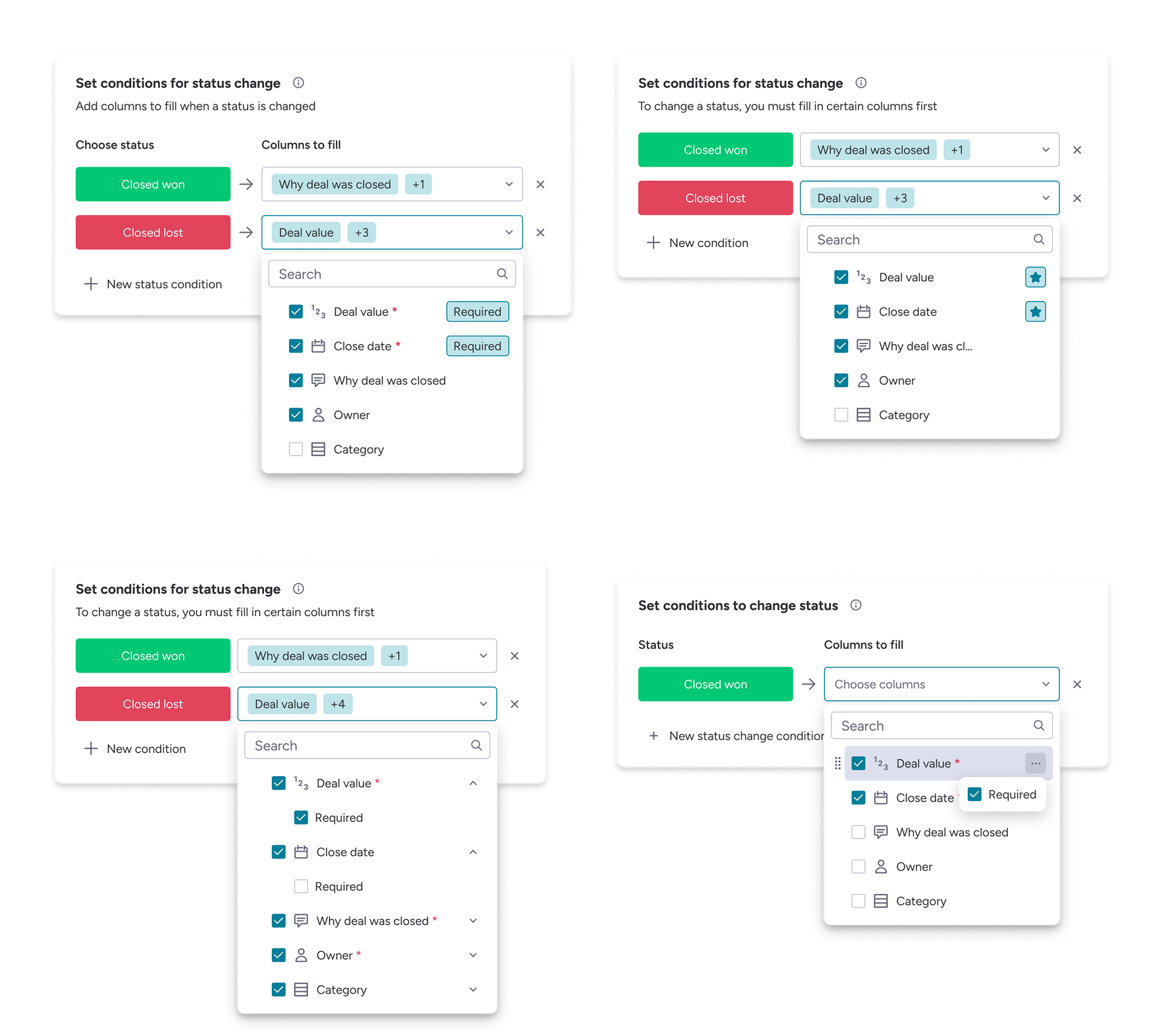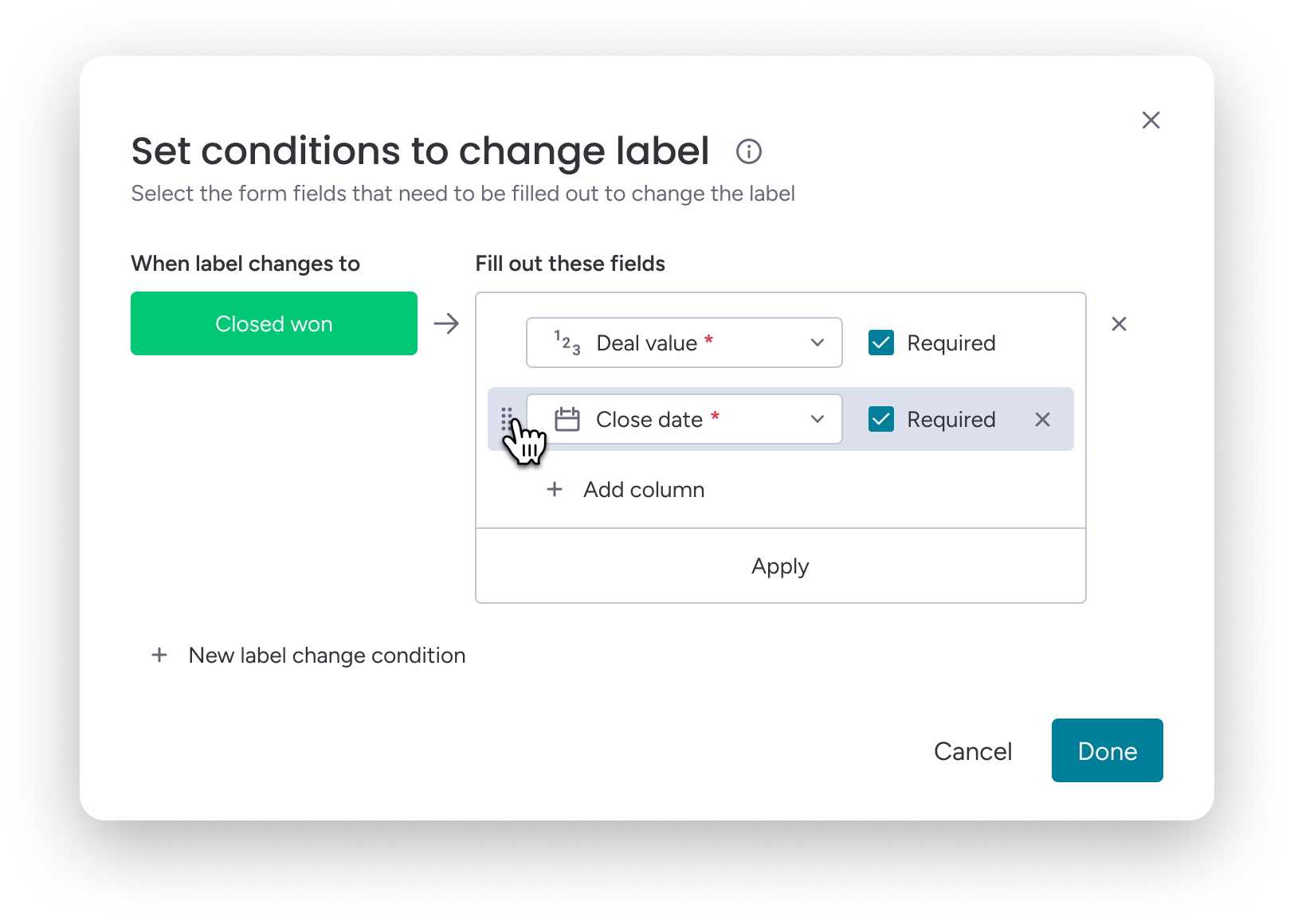 Redesigned setup that aligns required fields with pipeline stages, matching how managers already think about deal progression.