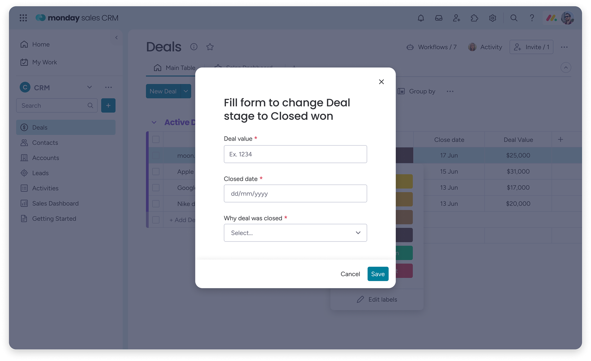 When required data is missing, a focused form appears to collect the information before the deal can advance.